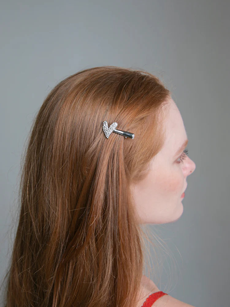 A Love Hair slide made from polished silver tone metal, set with glistening crystals, shaped into a cute heart motif. Slip it into a sleek ponytail or tousled waves.